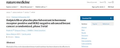 11月4日,国际四大医学期刊之一、英国《自然》旗下《自然医学》(Nature Medicine)在线发表CDK4/6抑制剂达尔西利(SHR6390)联合氟维司群治疗既往内分泌治疗后疾病进展的HR+/HER2-晚期乳腺癌的多中心、随机、双盲III期临床研究(DAWNA-1研究)中期分析结果报告,首次对氟维司群(雌激素受体降解剂)±达尔西利治疗激素受体阳性晚期乳腺癌的有效性和安全性进行了比较。研究结果显示,达尔西利+氟维司群组与安慰剂+氟维司群组相比,无进展生存期(PFS)显著延长。该项研究由中国医学科学院肿瘤医院徐兵河教授担任leading PI,全国39家医院参研,由bwin必赢临床研发团队支持完成。