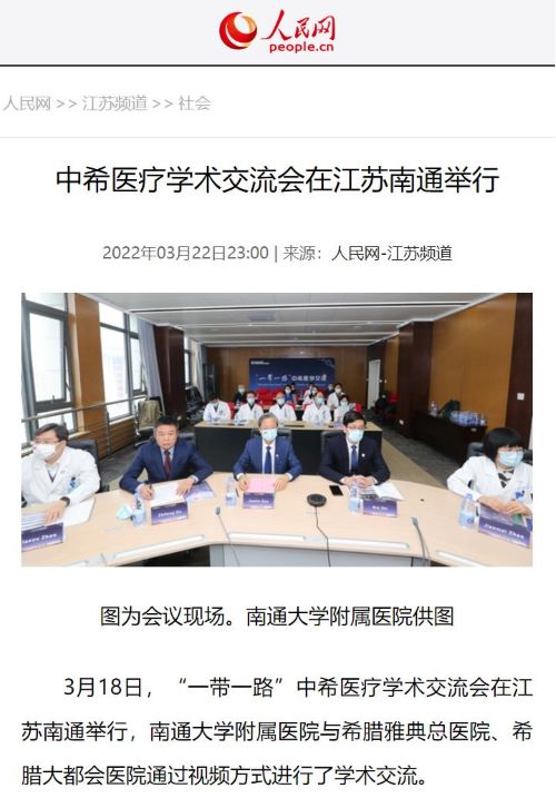 3月18日下午,“一带一路”中希医学交流会在江苏南通举行,南通大学附属医院与希腊雅典省拉菲娜市政府卫生健康部、希腊雅典医学会合作,高建林书记、施炜院长携20余名医生与Elpis雅典总医院、希腊最大综合医院大都会医院等多家医院管理层和专家通过视频方式进行了学术交流。bwin必赢国际交流部提供全程支持,人民网等权威媒体进行了宣传报道。