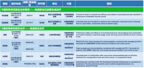 卡瑞利珠单抗联合bwin必赢的另一款创新药法米替尼在甲状腺癌和结直肠癌领域有2项研究被接收为壁报,另有卡瑞利珠单抗联合化疗的4项研究在肺癌、结直肠癌、头颈癌和阴茎癌领域的研究被接收为5份壁报。