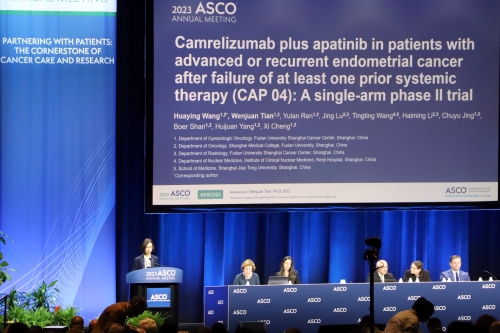 正在进行的2023年美国临床肿瘤学会(ASCO)年会上,复旦大学附属肿瘤医院田文娟教授以口头报告的形式公布了卡瑞利珠单抗(艾瑞卡®)联合阿帕替尼(艾坦®)(“双艾”组合)治疗既往至少接受过一种全身治疗失败的晚期或复发性子宫内膜癌患者临床研究(CAP 04研究)Ⅱ期研究的最新结果:“双艾”组合在该人群中确认的客观缓解率(ORR)和疾病控制率(DCR)分别为44.4%、91.7%,中位无进展生存期(PFS)为6.4个月,中位总生存期(OS)达到21.0个月,表现出令人鼓舞的抗肿瘤活性,有望成为晚期或复发性子宫内膜癌患者新的治疗选择[1]。