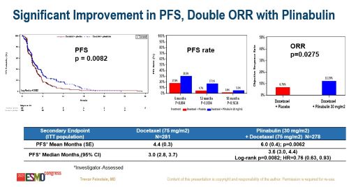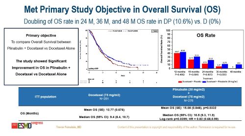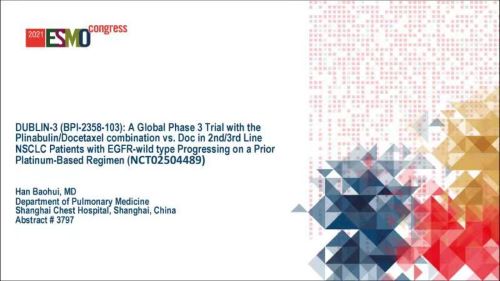 DUBLIN-3是一项国际多中心、III 期、随机对照临床研究,旨在评估普那布林联合多西他赛对比单药多西他赛在EGFR野生型NSCLC二/三线治疗中的安全性和有效性。研究在全球共纳入559例受试者,按1:1随机分组,两组受试者均在每个化疗周期(21天)的第1天接受75 mg/㎡多西他赛给药,联合治疗组在第1天多西他赛给药后1小时和第8天给予30 mg/㎡普那布林。研究的主要终点为OS,次要终点包括:ORR、PFS、4级中性粒细胞减少症的发生率、24个月 OS 率、36 个月OS率、48个月OS率等。