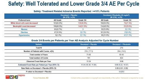 平均PFS为6.0个月vs 4.4个月,中位PFS为3.6个月vs 3.0个月,ORR为12.23% vs 6.76%,4级中性粒细胞减少症的发生率显著下降(第一疗程第8天:27.8% vs 5.26%;全部疗程第8天:33.58% vs 5.13%)。