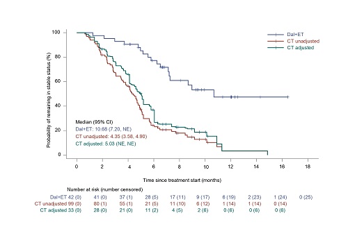 对CT组的157例患者数据进行分析。经IPTW调整后,有效样本量约为50例(表1)。与CT组相比,达尔西利+ET组的中位PFS更长(中位10.74个月 vs. 4.63个月;HR=0.316[95% CI,0.191-0.521],P<0.0001),中位TTF也更长(中位9.46个月 vs. 4.14个月;HR=0.301[95% CI,0.184-0.494],P<0.0001)。达尔西利+ET组中位DDC为10.68个月,CT组中位DDC为5.03个月(图2)。