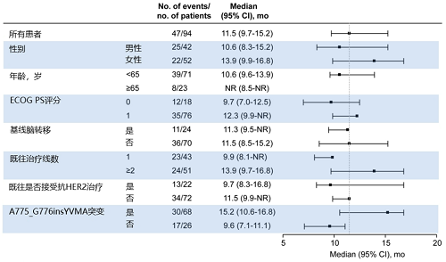 基于IRC评估的ORR为74.5%(95% CI:64.4-82.9),DCR为98.9%(95% CI:94.2-100.0),中位缓解持续时间(DoR)为9.8个月(95% CI:8.3-13.9)。在亚组分析中,瑞康曲妥珠单抗的疗效在不同亚组患者中保持一致,无论患者是否接受过抗HER2 TKI治疗,或者是否存在基线脑转移。
