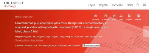 1. Cheng H, Zong L, Kong Y, et al. Camrelizumab plus apatinib in patients with high-risk chemorefractory or relapsed gestational trophoblastic neoplasia (CAP 01): a single-arm, open-label, phase 2 trial. Lancet Oncol 2021. Published online first.