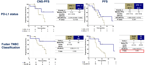 亚组分析显示,在PD-L1阴性(CPS<1)人群中,CNS-PFS为11.5个月,在PD-L1阳性(CPS≥1)人群中,CNS-PFS由于事件数较少尚未达到;整体PFS在PD-L1阴性和阳性人群中分别为7.6个月和10个月。