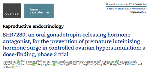 1. Chi H, Song Y, Jin L, et al. SHR7280, an oral gonadotropin-releasing hormone antagonist, for the prevention of premature luteinizing hormone surge in controlled ovarian hyperstimulation: a dose-finding, phase 2 trial. Hum Reprod 2025:deaf082.