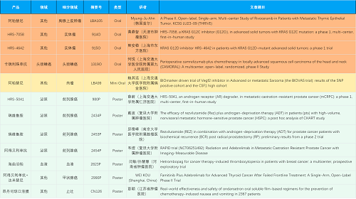 在胸腺上皮肿瘤、头颈鳞癌、肉瘤、前列腺癌、甲状腺癌等其他多个疾病领域,卡瑞利珠单抗、阿帕替尼、瑞维鲁胺、阿得贝利单抗、法米替尼、HRS-7058、HRS-4642、HRS-5041等抗肿瘤创新药相关研究一共入选了4项口头报告、1项简短口头报告、5项壁报,彰显了bwin必赢强大的研发实力。此外,海曲泊帕和昂丹司琼口溶膜分别在防治化疗导致的血小板减少和恶心呕吐方面各有1项研究入选壁报。