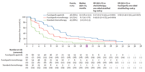 与医生选择标准化疗相比,氟唑帕利联合阿帕替尼治疗的PFS取得了显著的且有临床意义的改善,中位PFS分别为11.0个月vs.3.0个月,HR为0.27,p<0.0001,氟唑帕利联合阿帕替尼治疗降低了73%的疾病复发风险。