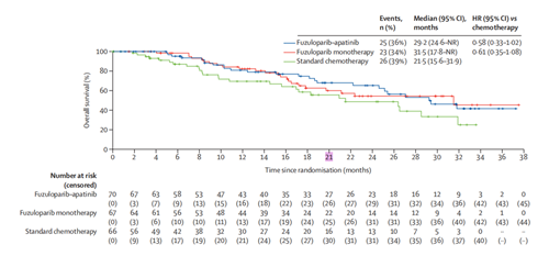 与医生选择标准化疗相比,氟唑帕利联合阿帕替尼治疗的OS展示出良好的获益趋势,中位OS分别为29.2个月vs.21.5个月,HR为0.58,氟唑帕利联合阿帕替尼治疗降低了42%的死亡风险。
