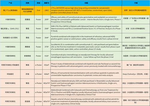在消化系统肿瘤领域,恒瑞产品相关研究共入选1项最新突破性摘要(LBA)、5项壁报和5项电子壁报,共11项研究。其中阿得贝利单抗入选4项研究、卡瑞利珠单抗入选3项研究。